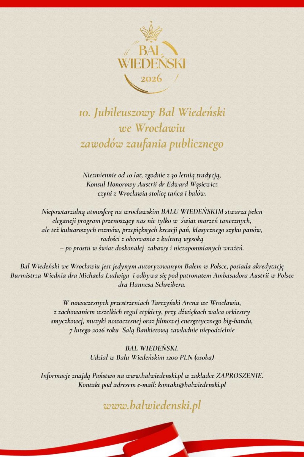 Zapraszamy na 10. Jubileuszowy Bal Wiedeński zawodów zaufania publicznego, który odbędzie się 7 lutego 2026 na stadionie Tarczyński Arena we Wrocławiu!